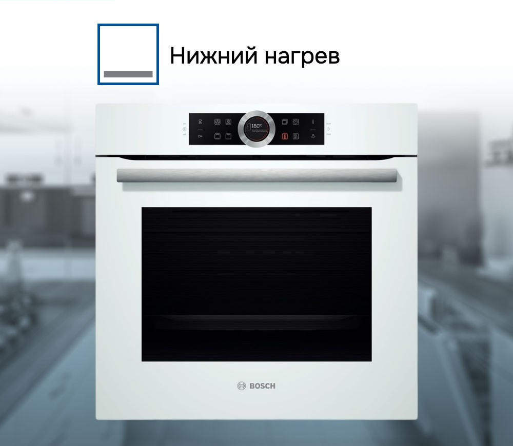 Духовой шкаф Bosch HBG634BW1 оснащен эргономичной панелью управления с поворотным переключателем Control Ring. Сенсорный дисплей с отображением меню, включающим все возможные подсказки и советы. Дополнительная кнопка «Info» значительно упростит выбор режима.