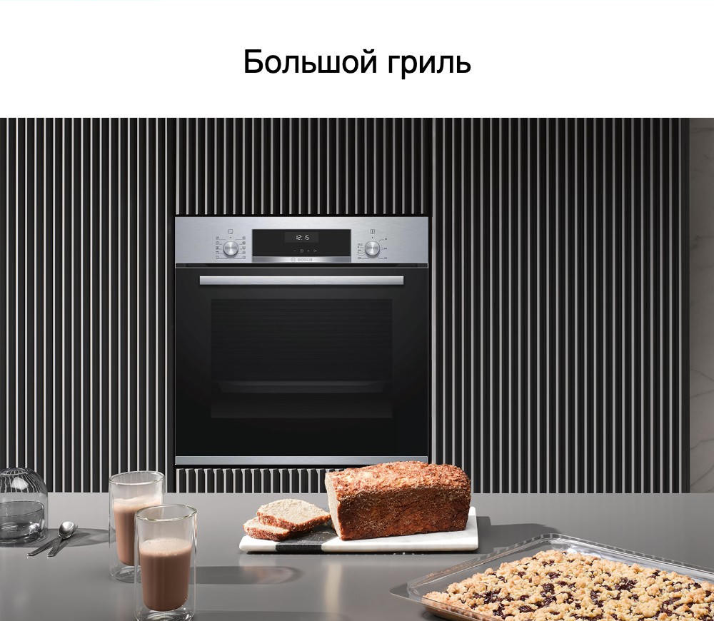 Встроенная панель управления включает в себя два утапливаемых переключателя и сенсорный дисплей. Такой тип управления — это не только достижение результата легким касанием руки. Это надежность, т.к. сенсорные панели укрывают электронику от внешних загрязнений. Это точность настроек, поскольку чувствительные датчики улавливают едва заметные перемещения пальцев. Благодаря подсветке внутренне камеры можно удобно следить за процессом готовки пищи. На двух уровнях духового шкафа Бош HBJ558YS0Q расположены выдвижные телескопические направляющие. За счет этого Вам будет особенно легко ставить тяжелые противни в прибор, а затем доставать их.