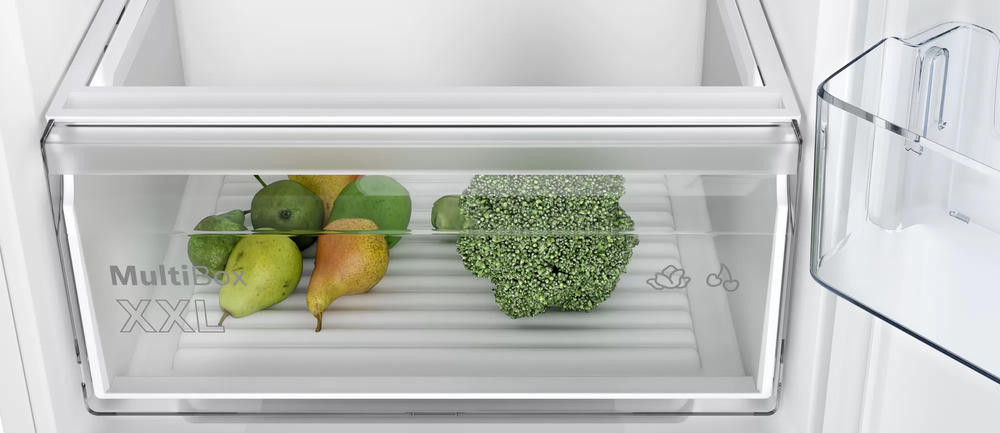 Система охлаждения No Frost предотвращает образование инея и обеспечивает равномерное распределение холода по всему объему холодильной камеры. Автоматическая система размораживания облегчает уход за устройством, а функция суперохлаждения позволяет быстро охладить продукты после покупки. Внутреннее пространство холодильника продумано до мелочей. Четыре полки из высокопрочного стекла, три из которых можно регулировать по высоте, позволяют оптимально распределить продукты. Выдвижной контейнер MultiBox идеален для хранения овощей и фруктов, а три полки на дверце обеспечивают дополнительное пространство для хранения. Светодиодное освещение обеспечивает яркий и равномерный свет, позволяя легко найти необходимые продукты.