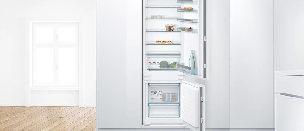 Встраиваемый двухкамерный холодильник Bosch KIV87VS30M оснащен светодиодным освещении, оно не требует постоянной замены и равномерно освещает все полки прибора. Специальные датчики FreshSense отслеживают температуру внешней среды и внутренней и исходя из этого регулируют баланс. Функция SuperFreezing поддерживает холод при добавлении новый продуктов.