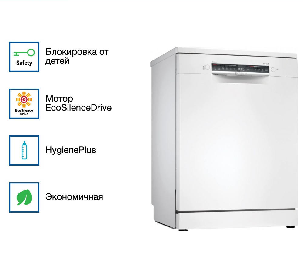 Посудомоечная машина Bosch SMS4IMW62Q — это отдельностоящая полноразмерная модель, которая сочетает в себе функциональность, стиль и надежность. Произведенная в Турции, эта машина обеспечивает гарантию на 12 месяцев, что подтверждает ее высокое качество и долговечность. Основной цвет машины — белый, что придает ей современный и элегантный вид, позволяя без труда вписаться в любой интерьер кухни. Машина оснащена инверторным двигателем EcoSilence Drive, который обеспечивает тихую и эффективную работу. Модель оборудована программами и температурными режимами, включая автоматическую, быструю, экономичную и интенсивную программы. Дополнительно предусмотрена. Посудомоечная машина Bosch SMS4IMW62Q оснащена нагревательным элементом проточного типа. Сенсор чистоты воды AquaSensor гарантирует эффективное и качественное мытье посуды. Панель управления машины закрытая, что обеспечивает удобство и безопасность использования. Дисплей и кнопки управления позволяют легко и быстро выбирать необходимые программы и настройки. Машина оснащена тремя корзинами для посуды и переставляемым по высоте верхним коробом с системой Rackmatic-3. Это обеспечивает гибкость и удобство при загрузке различной посуды. Система защиты от протечек обеспечивают безопасность эксплуатации машины. Блокировка от детей и встроенный предохранительный клапан являются дополнительными элементами безопасности. Материал внутреннего резервуара — нержавеющая сталь, что обеспечивает долговечность и устойчивость к коррозии. Машина имеет класс энергопотребления A++, что гарантирует экономичность и эффективность работы.