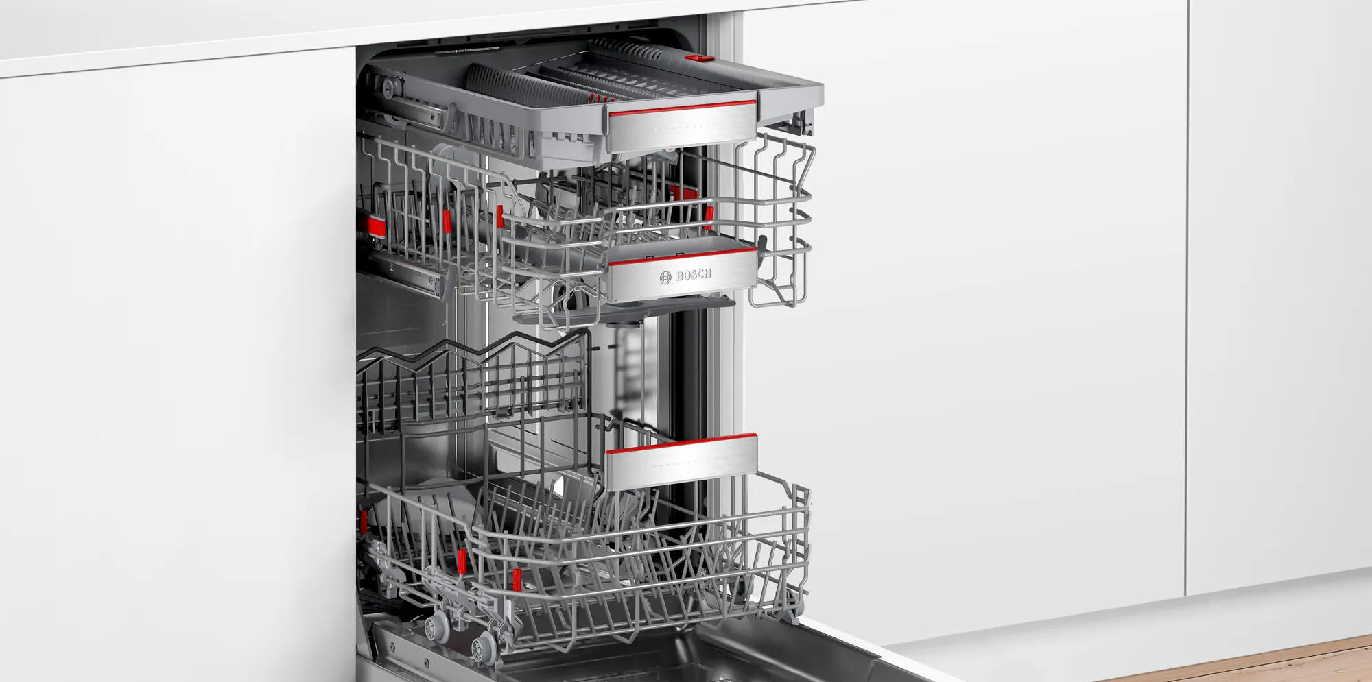 Посудомоечная машина Bosch SPI6ZMS35E имеет корзину для столовых приборов Vario Drawer Pro. С помощию Triple Rackmatik вы можете регулировать высоту посуды при полной загруженной верхней корзине. Функция «любимая программа» вы можете настроить свои любимые программы и включать их через приложение Home connect.