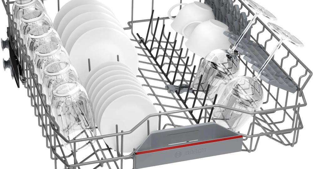 Техническая начинка ориентирована на долговечность и энергоэффективность: инверторный мотор EcoSilence Drive обеспечивает тихую работу на уровне 42 дБ и высокий ресурс без обслуживания щеток, а класс энергопотребления соответствует категории A по обновлённой шкале. Система теплообменной сушки делает посуда сухой и безопасной для деликатных материалов, при этом дополнительная опция экстра-сушки улучшает результат при плотных загрузках. Управление реализовано через закрытую панель с дисплеем и кнопочными элементами, дополнительно доступна интеграция с Home Connect для удалённого запуска через приложение на смартфоне и контроля цикла из любой точки.