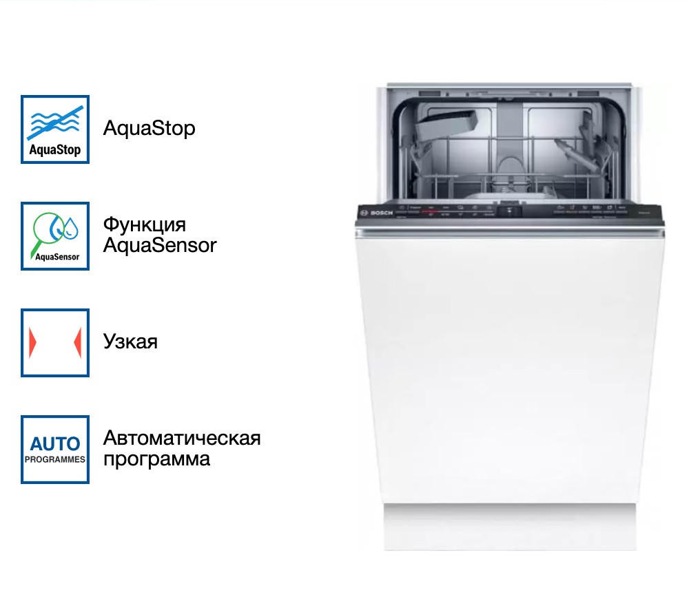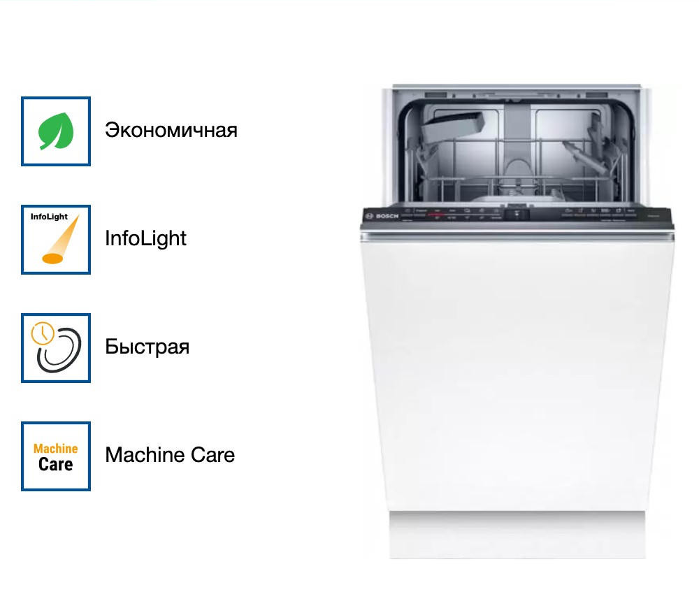 Встраиваемая посудомоечная машина Bosch SPV2HKX39E с инверторным мотором работает по технологии ActiveWater, которая увеличивает эффективность мытья посуды при минимальном расходе воды. Модель использует 8,5 л воды за один рабочий цикл при уровне шума не более 48 дБ. Отличительная особенность прибора — наличие индикатора Infolight, который отображается на полу. Внутренняя камера располагает местом под девять комплектов посуды и оснащается теплообменником для сушки. В электронную систему устройства предустановлено пять рабочих программ, а также функция для ускоренной мойки. Защитная система представлена специальным клапаном Aquastop, который прекращает подачу воды при отсутствии давления в системе, также есть режимы автоматического отключения и самодиагностики неисправностей.