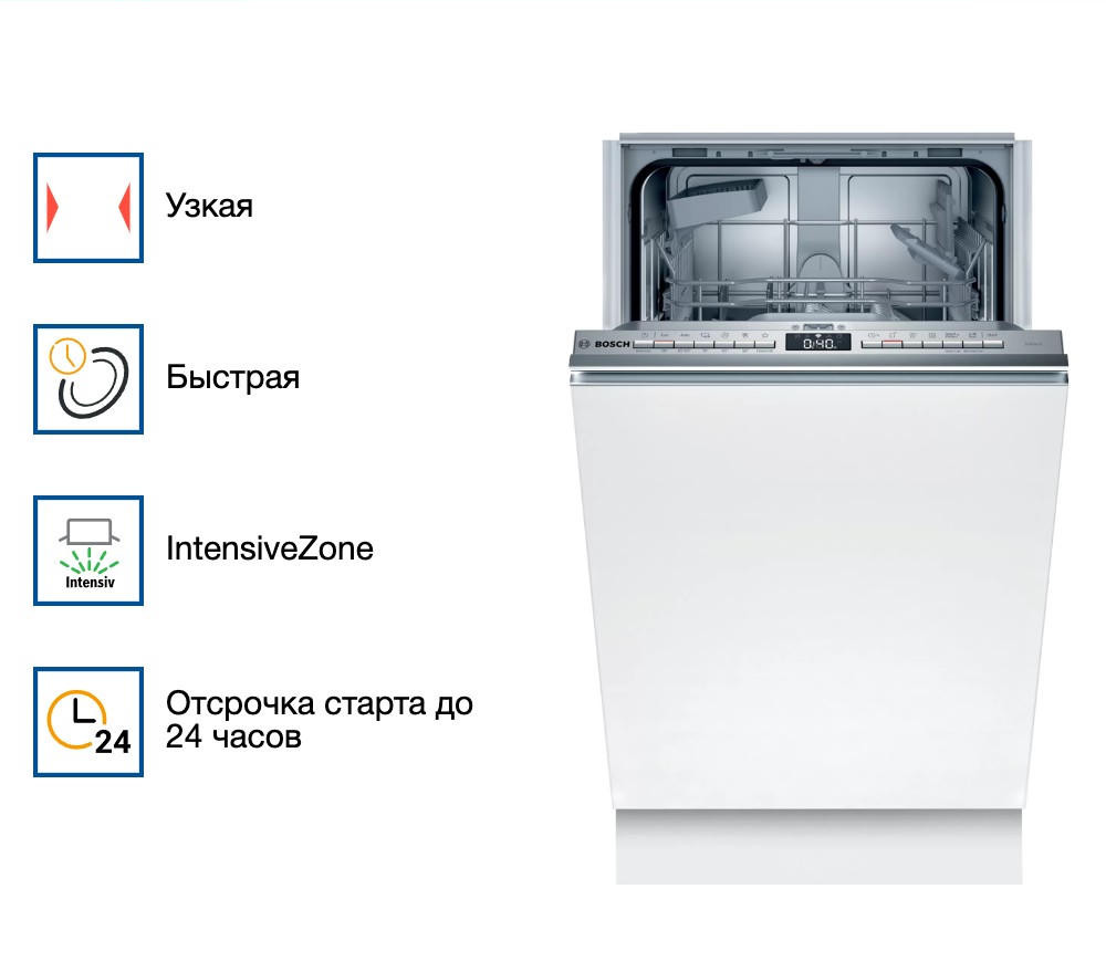 Bosch SPV4HKX45E имеет функцию Extra Dry, которая повышает температуру последнего полоскания и увеличивает время сушки, благодаря этому пластиковая посуда всегда будет сухой. Технология «Луч на полу» или InfoLight поможет вам быть в курсе об окончании работы прибора. Отложенный старт позволит запустить прибор в любое нужное вам время.