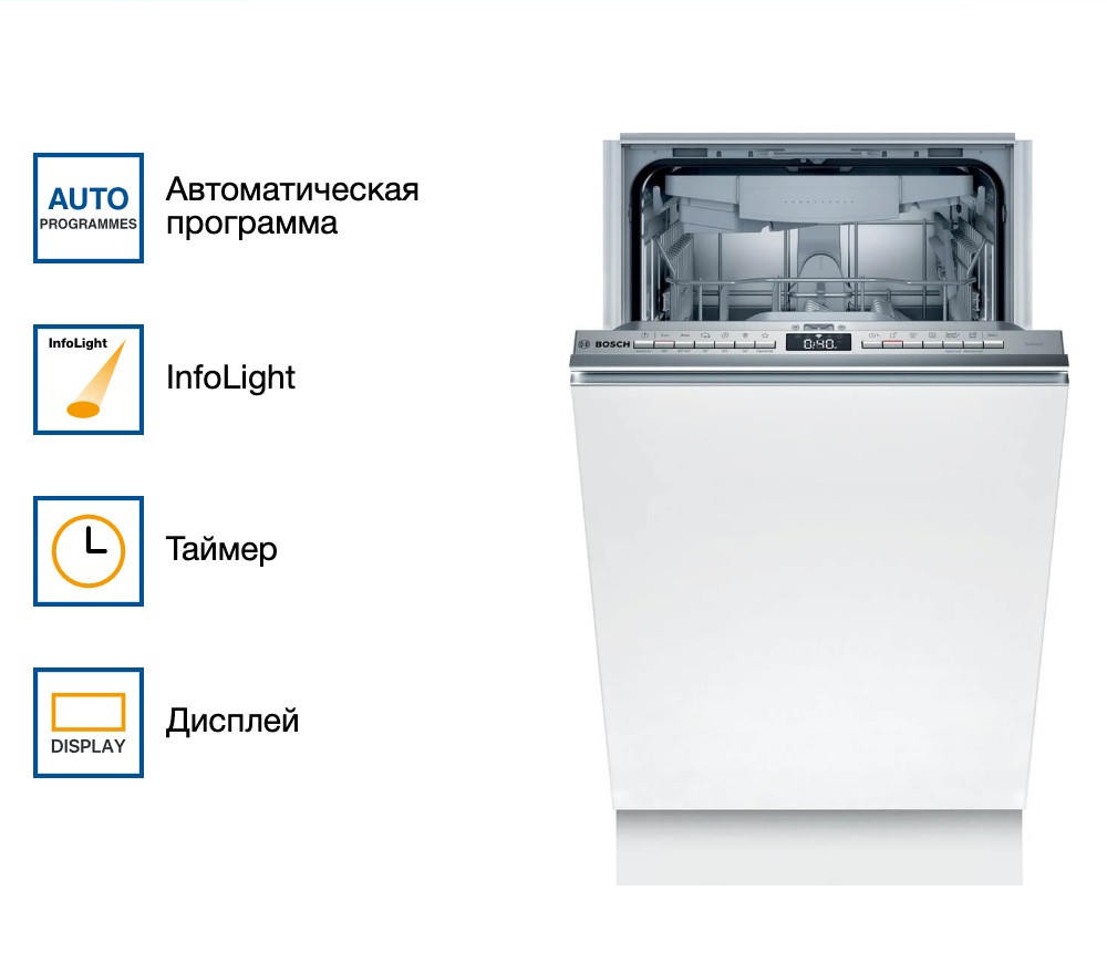 Посудомоечная машина BOSCH SPV4XMX16E — это узкая встраиваемая модель с современным функционалом. Система защиты AquaStop сработает в случае неожиданной протечки и автоматически перекроет подачу воды.
