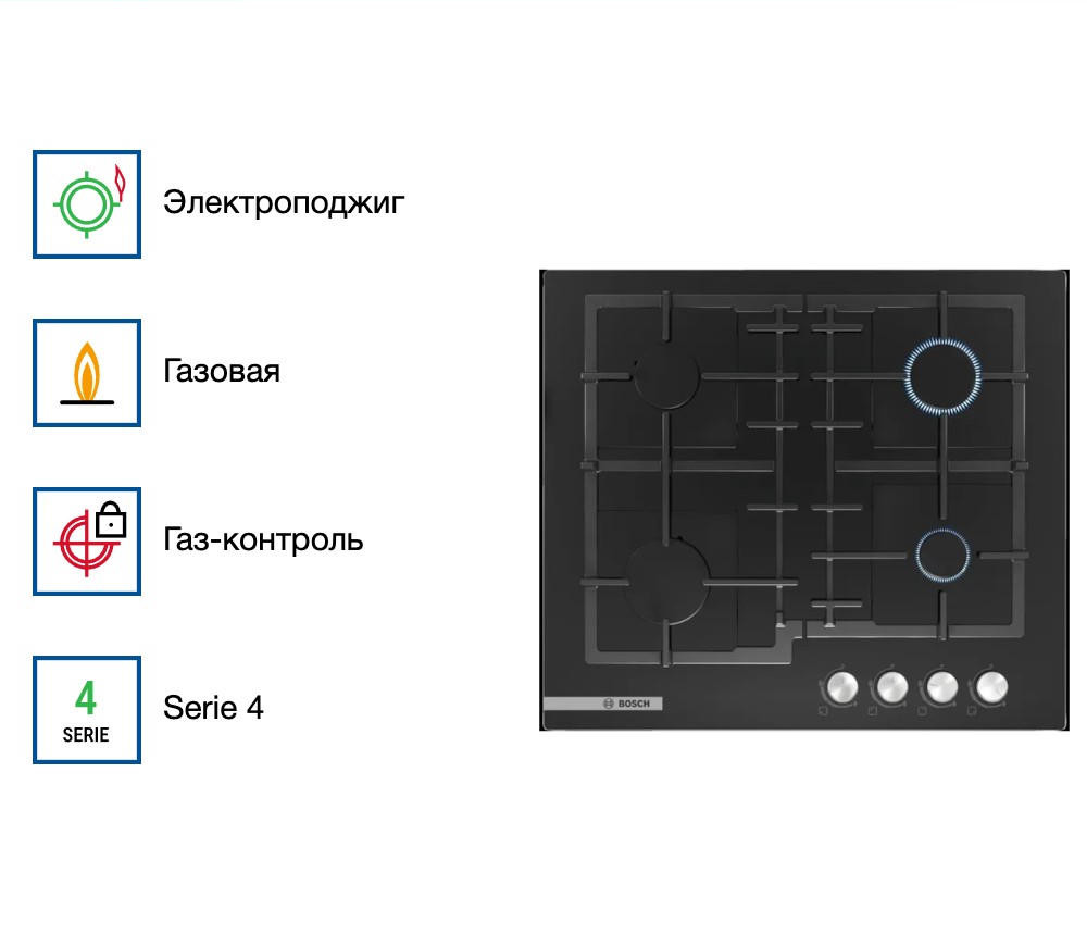 Газовая плита с переключателями, расположенными с фронта: удобство управления нужными конфорками. Варочная панель Bosch PNP6B6O93R изготовлена из закаленного стекла. Четыре мощные газовые конфорки позволяют готовить несколько блюд одновременно, а чугунные решетки обеспечат устойчивость посуды и лёгкость очистки.