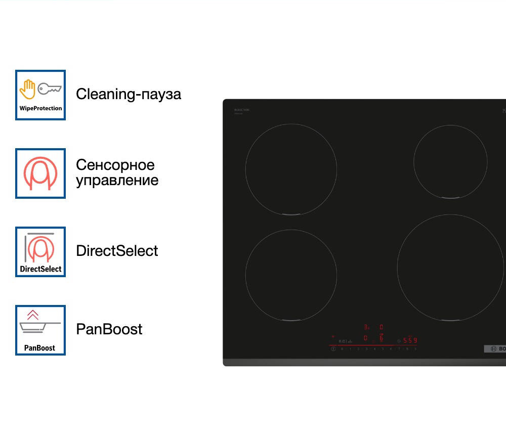 Варочная панель оснащена системой управления DirectSelect, которая обеспечивает быстрый и точный выбор требуемой степени мощности. Всего доступно 17 ступеней мощности, что позволяет точно настроить температуру приготовления. Функции PanBoost, ReStart и PowerBoost позволяют быстро нагревать посуду, продолжать приготовление после паузы и увеличивать мощность нагрева для более быстрого приготовления. Благодаря функции PowerManagement, панель оптимизирует потребление энергии, что позволяет экономить на электроэнергии.