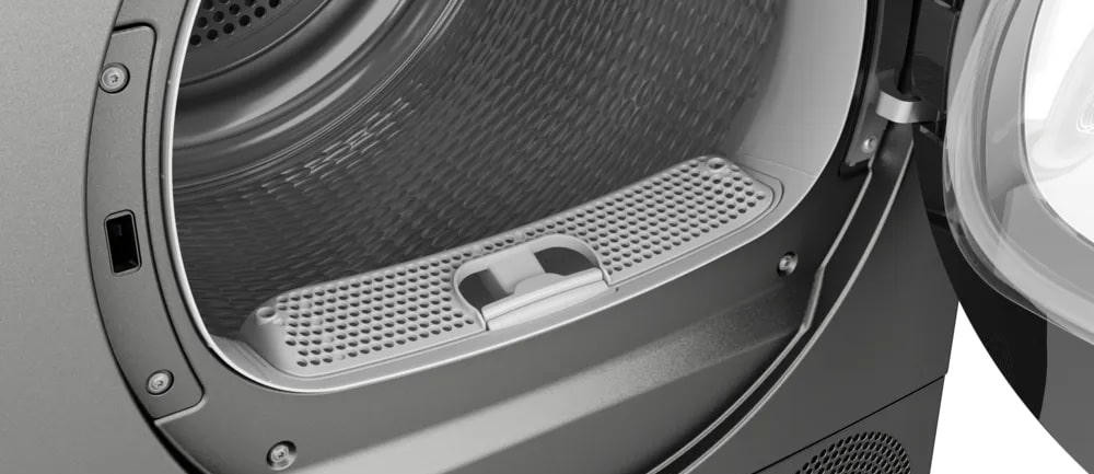 Технологическая начинка сосредоточена вокруг энергоэффективной конденсационной системы с тепловым насосом: аппарат аккуратно извлекает влагу, возвращая часть тепла в процесс и снижая потребление, что подтверждено классом энергопотребления C и максимальной нагрузкой 9 кг. Контейнер для конденсата присутствует, но при необходимости предусмотрен вывод воды напрямую в канализацию — удобно при постоянной эксплуатации. Самоочищающийся конденсатор и легко доступный ворсовый фильтр обеспечивают стабильную производительность и минимизируют обслуживание, сохраняя эффективность с течением времени.