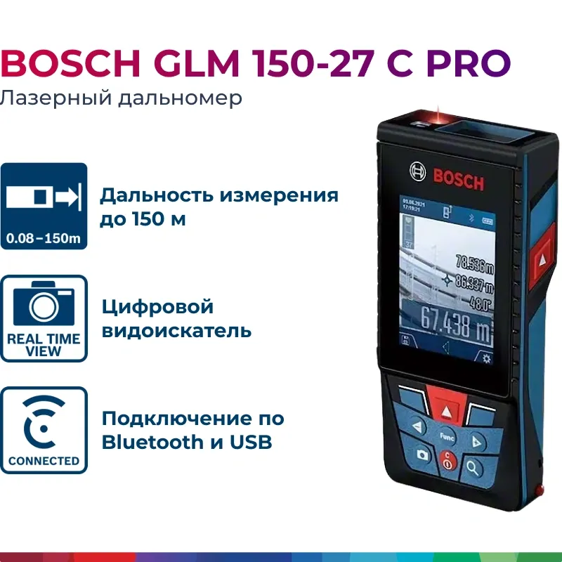 ЛазерныйДальномер Bosch GLM 150-27 C имеет встроенный литий-ионный аккумулятор, обеспечивающий длительное время работы и большую гибкость.