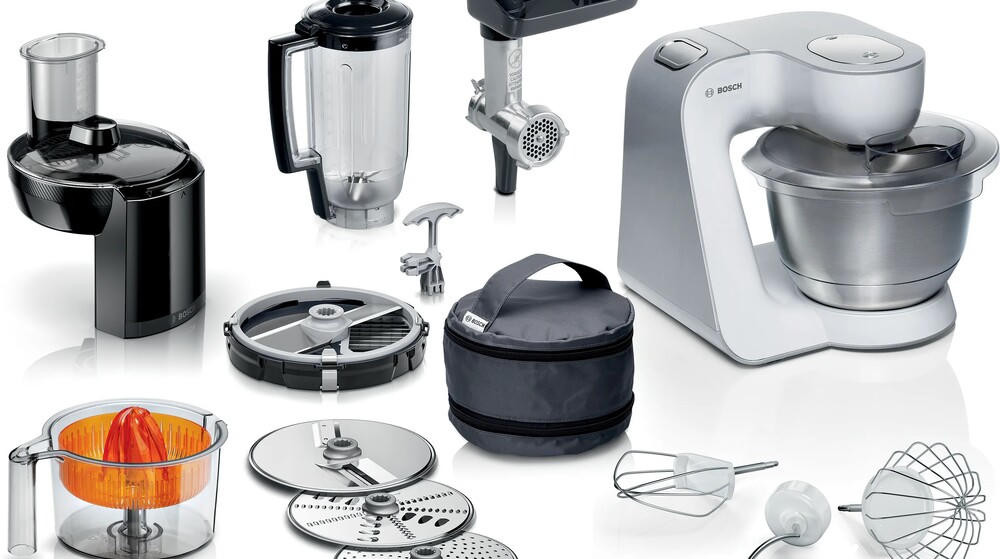 Инженерные решения ориентированы на комфорт и универсальность: технология EasyArmLift облегчает установку и снятие насадок, автоматическая парковка позволяет аккуратно разместить инструмент во время пауз, а защита от перегрузки и от повторного включения оберегают мотор и продлевают срок службы. Прибор оснащён тремя приводами и четырьмя точками подключения, что делает возможным использование множества принадлежностей и комбинирование функций в зависимости от задач. В комплект входят двенадцать дополнительных аксессуаров, среди которых двухсторонние диски для шинковки и тёрки (крупная/мелкая), венчик для взбивания, крюк для теста и насадка для нарезки кубиками — все металлические элементы можно мыть в посудомоечной машине для удобства обслуживания.