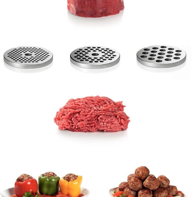 Эргономичность использования обеспечивается наличием пяти насадок, включая формовочные диски для фарша с отверстиями диаметром 3, 4.8 и 8 мм. Также в комплект входят насадки для приготовления колбас и кеббе, что открывает новые горизонты для кулинарных экспериментов. Универсальный толкатель и обычный загрузочный лоток из пластика делают процесс подачи продуктов удобным и безопасным.