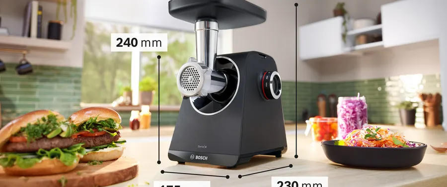 Мясорубка Bosch MFWS450B выполнена из прочного пластика, что делает прибор стильным и практичным элементом кухонного пространства. Небольшие размеры (24.7 х 20 х 24 см) и вес 4.9 кг облегчают размещение на рабочей поверхности и хранение, а прорезиненные ножки обеспечивают устойчивость при интенсивной эксплуатации. Модель из серии MultiPower Series 4 сочетает аккуратный внешний вид с функциональной компоновкой: загрузочный лоток пластиковый, удобной конфигурации, позволяет быстро подавать куски продукта к механизму, а универсальный толкатель повышает безопасность и эффективность работы. В корпус встроены отсеки для хранения насадок и для сетевого шнура, что сохраняет порядок и сокращает время подготовки к использованию.