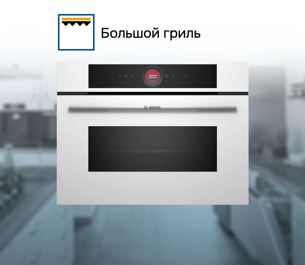 Система Home Connect дает возможность управлять прибором дистанционно через смартфон или планшет, что добавляет удобства в использовании. Духовой шкаф Bosch CMG7241W1 оснащен десятью режимами нагрева, включая верхний/нижний жар, большой и малый гриль, гриль с конвекцией, нижний жар, подогрев посуды и автоматический быстрый разогрев. Это позволяет приготовить практически любое блюдо, от классической пиццы до изысканного десерта. Внутреннее LED-освещение обеспечивает хороший обзор процесса приготовления пищи. Дверца шкафа откидная, с амортизатором SoftClose, что обеспечивает мягкое и плавное закрытие. Трехслойное остекление дверцы и система охлаждения прибора предотвращают перегрев и гарантируют безопасность использования. Блокировка от детей защищает от случайного включения или изменения режимов работы. В комплекте с шкафом идут комбинированная решетка и универсальный противень.