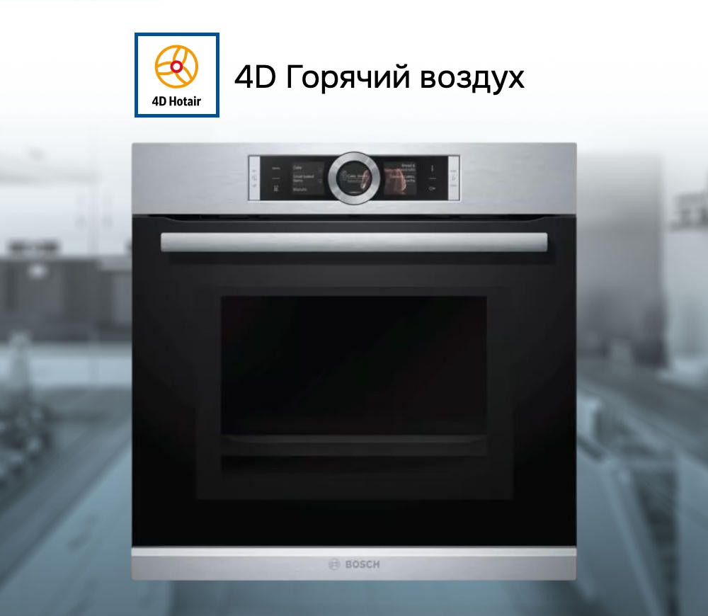 Духовой шкаф BOSCH HMG636RS1 оснащен функцией 4D Горячий воздух, которая представляет собой совместную работу кольцевого нагревательного элемента на задней стенке духового шкафа и конвекционного вентилятора, который приводится в действие BLDC мотором. Вентилятор вращается в обе стороны, за счёт чего происходит равномерное разогревание на нескольих (до 4-х) уровнях одновременно.