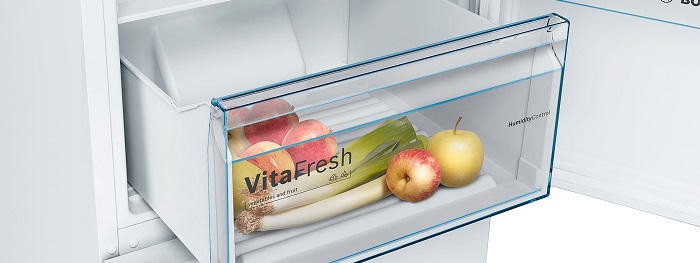 Холодильная камера модели оснащена 4 полками из ударопрочного стекла: две из них зафиксированы, две другие можно перемещать по высоте. Загружать и доставать продукты гораздо удобнее благодаря выдвижным полкам EasyAccess. Ящик VitaFresh сохраняет свежесть продуктов до 3 раз дольше, поддерживая наиболее оптимальную температуру и уровень влажности. На двери расположены 3 полки, на которых есть металлические аппликации. Свежесть обеспечивает угольный фильтр AirFresh, абсорбирующий неприятные запахи и нейтрализующий действие бактерий.