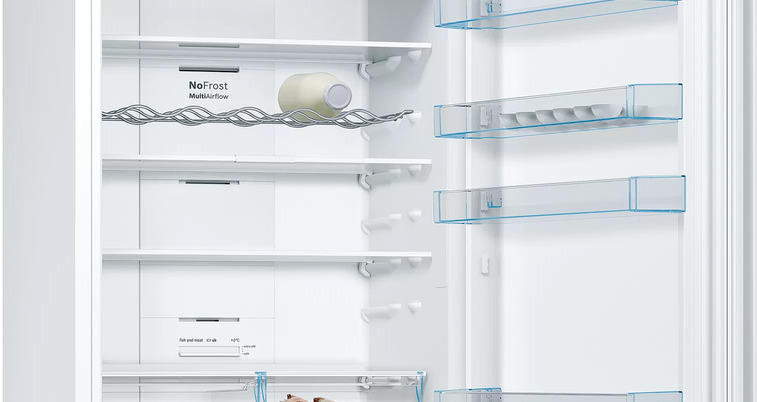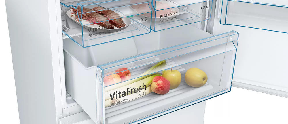 Двухкамерный холодильник Bosch KGN49XWEA имеет систему No Frost, она поддерживает постоянный поток сухого воздуха и предотвращает образование льда, вы можете забыть о размораживании холодильного и морозильного отделения. Выдвижная полка EasyAccess удобна, если холодильник полностью укомплектован. Имеется зона свежести прожуктов VitaFresh в ней удобно хранить свежую рыбу, мясо, овощи и фрукты до 0°C.