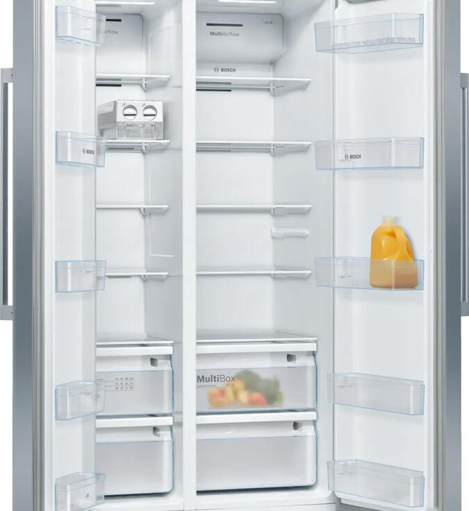 Холодильник Bosch KAN93VL30N из серии Serie 4, обладает общим полезным объемом 616 литров, из которых 371 литр приходится на холодильную камеру и 189 литров на морозильную камеру. Этот холодильник впечатляет своим современным дизайном и качественной отделкой из нержавеющей стали, которая придает ему элегантность и стиль. Управление устройством осуществляется с помощью сенсорных элементов и удобного электронного дисплея. Также холодильник оборудован функцией Home Connect, что позволяет управлять им дистанционно.