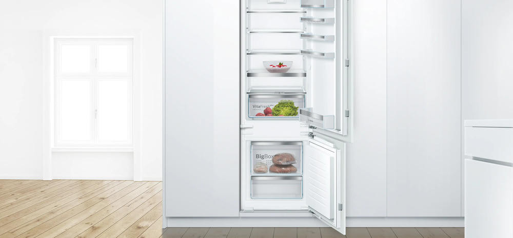 Встраиваемый двухкамерный холодильник Bosch KIS87ADD0 Этот встраиваемый агрегат сочетает лаконичный белый корпус и продуманную внутреннюю организацию, которая создана для тех, кто ценит порядок, экономичность и надежность. Серия Serie | 6 воплощает современный подход к хранению продуктов: общий полезный объем 270 л распределен так, чтобы холодильная камера занимала 208 л, а морозильная — 62 л, что обеспечивает комфортную вместимость для семьи. Инверторный компрессор и тип мотора инверторный гарантируют плавную работу и экономичное энергопотребление: годовой расход составляет 165 кВт·ч при мощности подключения 120 Вт, а уровень шума не превышает 35 дБ, благодаря чему прибор практически не мешает в повседневной жизни. Панель управления реализована электронно с удобными кнопками и информативным дисплеем, который позволяет точно задавать режимы работы. Холодильная камера оснащена системой статического охлаждения и ручным размораживанием, что способствует длительному сохранению качества продуктов при простоте обслуживания.