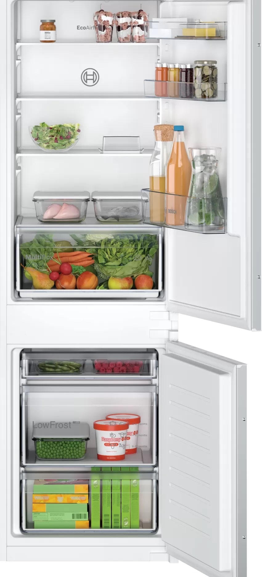Двухкамерный холодильник Bosch KIV 865 SF0 - встраиваемая модель с ящиком для овощей и фруктов MultiBox. Благодаря циркуляции EcoAirflow поддерживается постоянная температура по всей холодильной камере. Система охлаждения LowFrost уменьшает обледенение морозильной камеры, излишняя влага отводится наружу через специальное отверстие.