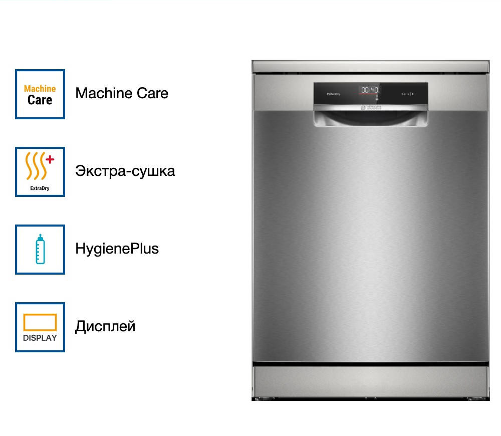 Посудомоечная машина Bosch SMS8YCI03E - это отдельностоящая, полноразмерная модель, выполненная в стильном дизайне из нержавеющей стали. Она принадлежит к серии Serie | 8 и оснащена инверторным двигателем EcoSilence Drive, который обеспечивает тихую и эффективную работу. Эта модель способна разместить до 14 комплектов посуды, что делает ее идеальным выбором для больших семей или активно приглашающих гостей хозяев. Машина оборудована восемью стандартными программами и пятью температурными режимами, включая быструю, экономичную, интенсивную, ночную и специальную программу для стекла при 40 градусах. Это позволяет подобрать наиболее подходящий режим для любого типа посуды. Система HygienePlus гарантирует высокий уровень гигиены, уничтожая до 99,9% бактерий и микробов. Особенностью данной модели является функция VarioSpeedPlus, которая позволяет сократить время мойки в три раза без потери качества. Также стоит отметить функцию Extra Dry, обеспечивающую идеальную сушку даже для трудносушимой посуды, такой как пластиковые изделия. Технология защиты стекла печет о сохранении блеска стеклянной посуды и предотвращения ее повреждения.