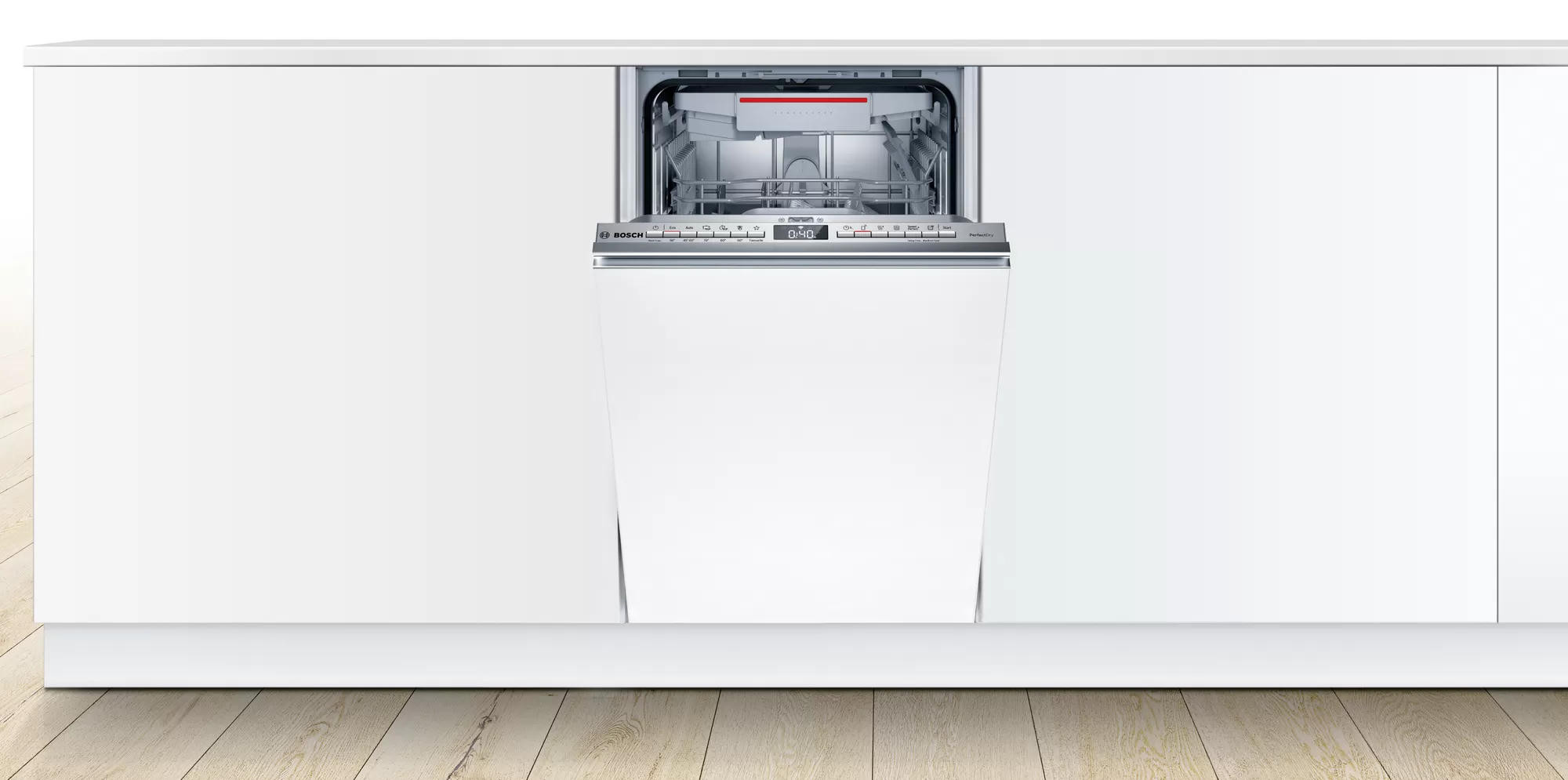 Встраиваемая посудомоечная машина Bosch SPV6ZMX01E выполнена в белом цвете и имеет следующие габариты: высота — 81,5 см, ширина — 44,8 см, глубина — 55 см. Она идеально подойдет для небольшого помещения и рассчитана на 10 стандартных комплектов. Если вы хотите, чтобы прибор закончил или начал свою работу к определенному времени, вы можете использовать функцию «Отложенный старт». Мытье посуды с помощью данной функции можно отложить от 1 до 24 часов.