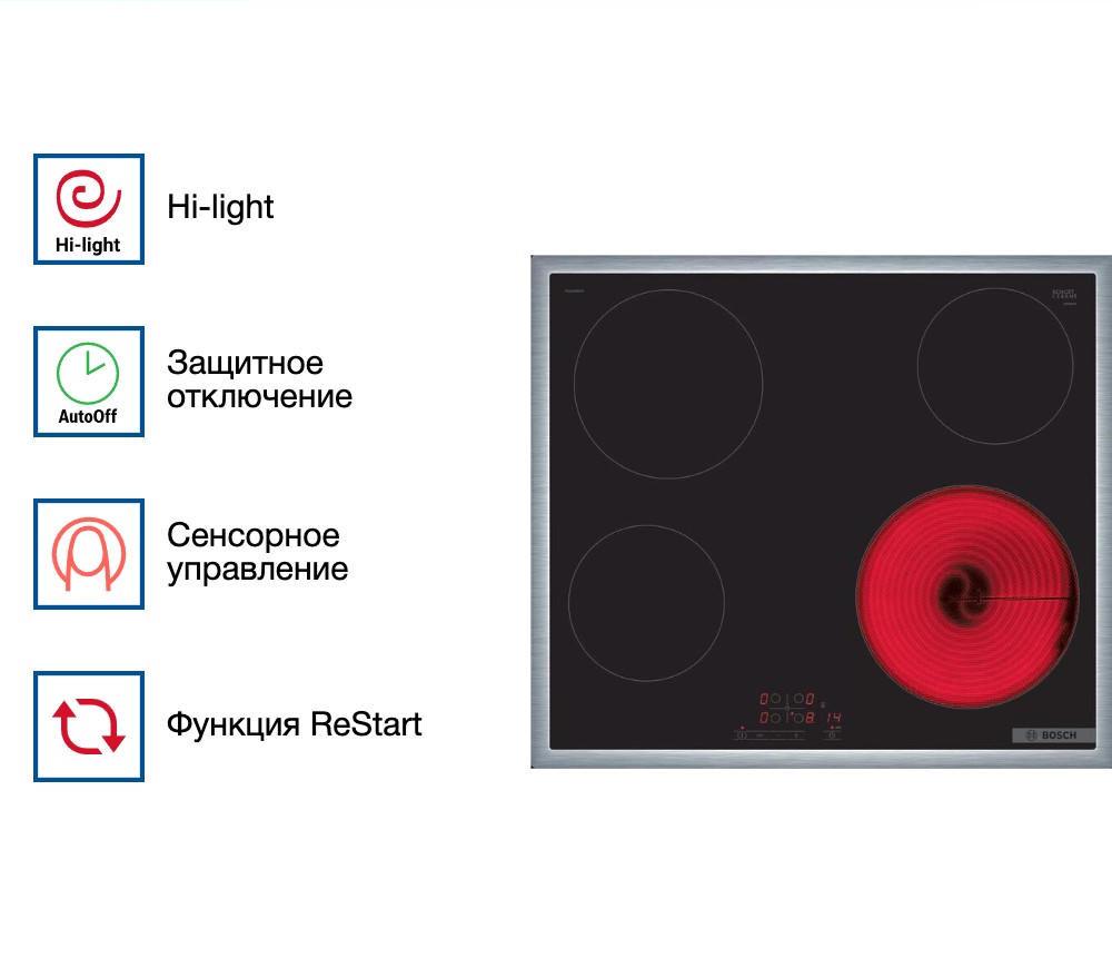 Удобство использования также обеспечивается наличием функции ReStart, которая позволяет быстро восстановить настройки после случайного отключения. Таймер с функцией отключения для каждой конфорки помогает контролировать процесс приготовления, а индикатор остаточного тепла предупреждает о горячих зонах, обеспечивая безопасность.