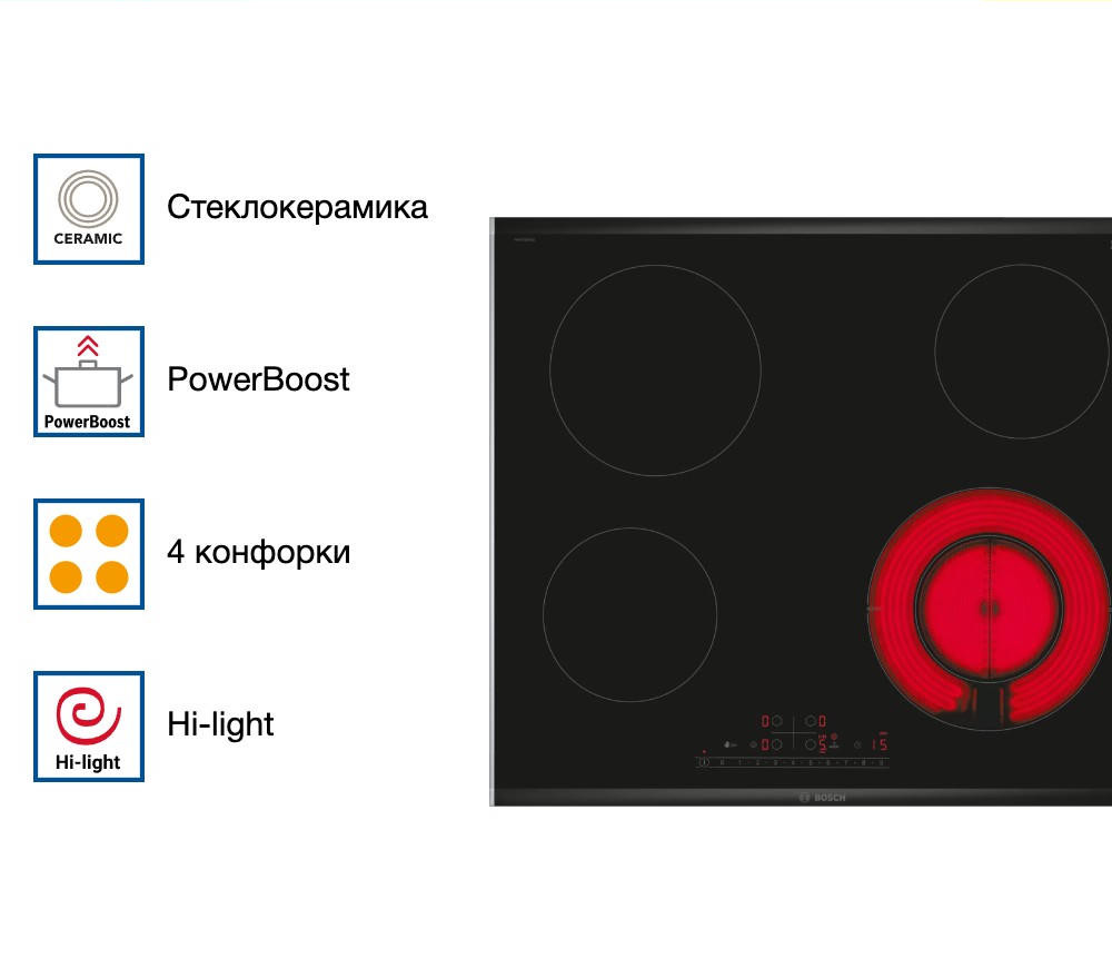 Варочная панель Bosch PKF675FP2E выполнена из стеклокерамики черного цвета, что придает ей элегантный и стильный вид. Металлический профиль по бокам придаёт дополнительную прочность и устойчивость к повреждениям.
