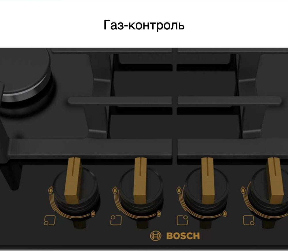 Органы управления у варочной панели Бош PPP6В690R находятся посередине оборудования, чтобы исключить риск соприкосновения с горячей посудой. Включение и управление газом осуществляется механическими поворотными ручками.