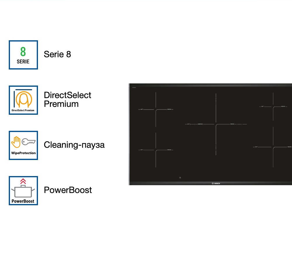 Пять зон нагрева, включая центральную трёхконтурную, дают полную свободу в выборе посуды — от маленькой кастрюльки до широкой сковороды. Панель сама определяет размер дна и активирует только нужную зону, не тратя энергию впустую. Управление — через сенсоры DirectSelect Premium: одно касание — и вы выбираете мощность из 17 уровней, запускаете таймер или включаете специальный режим.