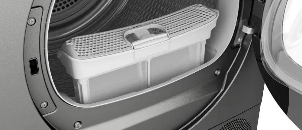 Технологическая начинка сосредоточена вокруг энергоэффективной конденсационной системы с тепловым насосом: аппарат аккуратно извлекает влагу, возвращая часть тепла в процесс и снижая потребление, что подтверждено классом энергопотребления C и максимальной нагрузкой 9 кг. Контейнер для конденсата присутствует, но при необходимости предусмотрен вывод воды напрямую в канализацию — удобно при постоянной эксплуатации. Самоочищающийся конденсатор и легко доступный ворсовый фильтр обеспечивают стабильную производительность и минимизируют обслуживание, сохраняя эффективность с течением времени.